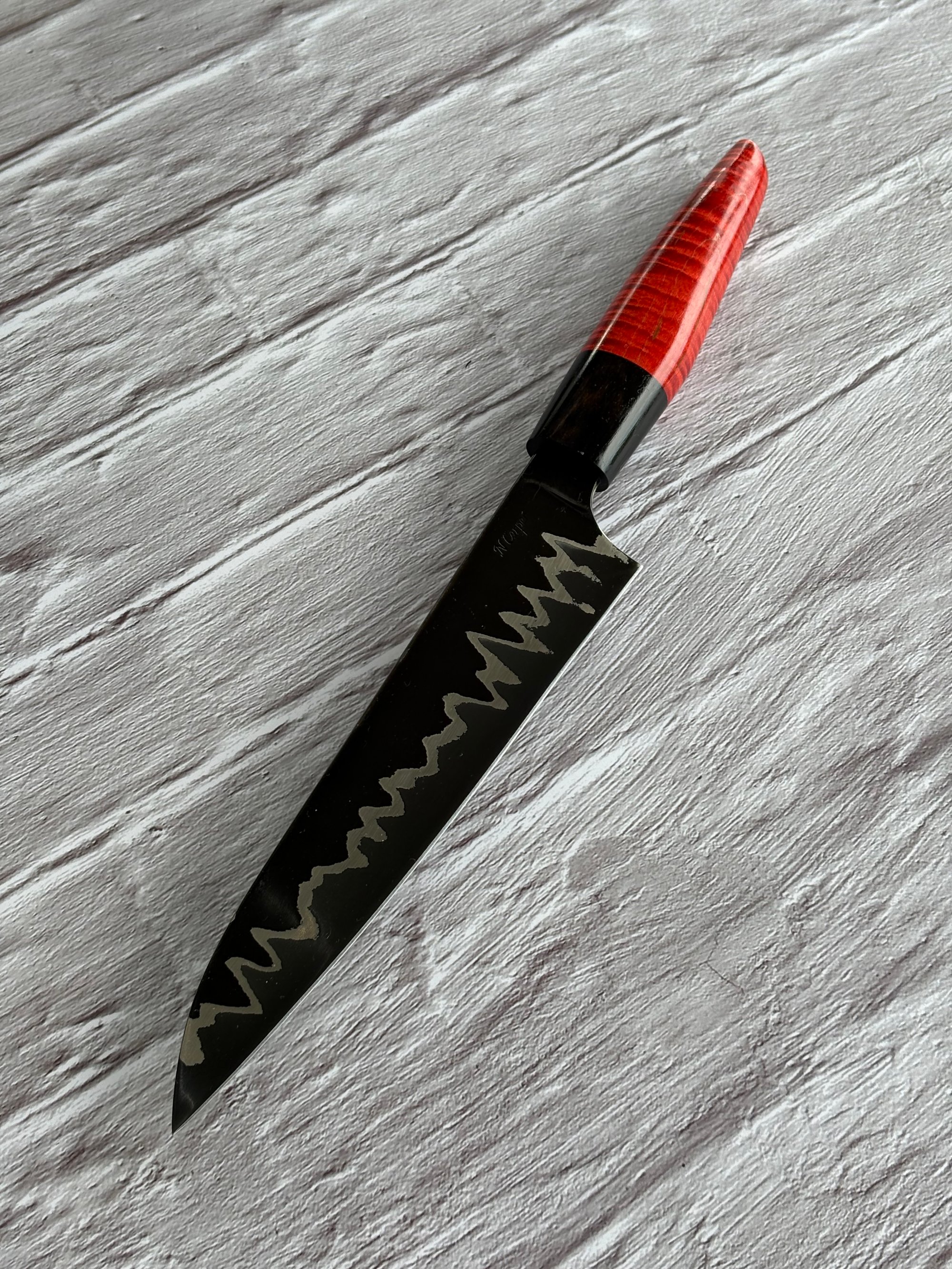 9.25” Gyuto knife in My Go Mai pattern. (1084/15n20,ni. Shim) Handle is Ebony and orange dyed and stabilized maple.