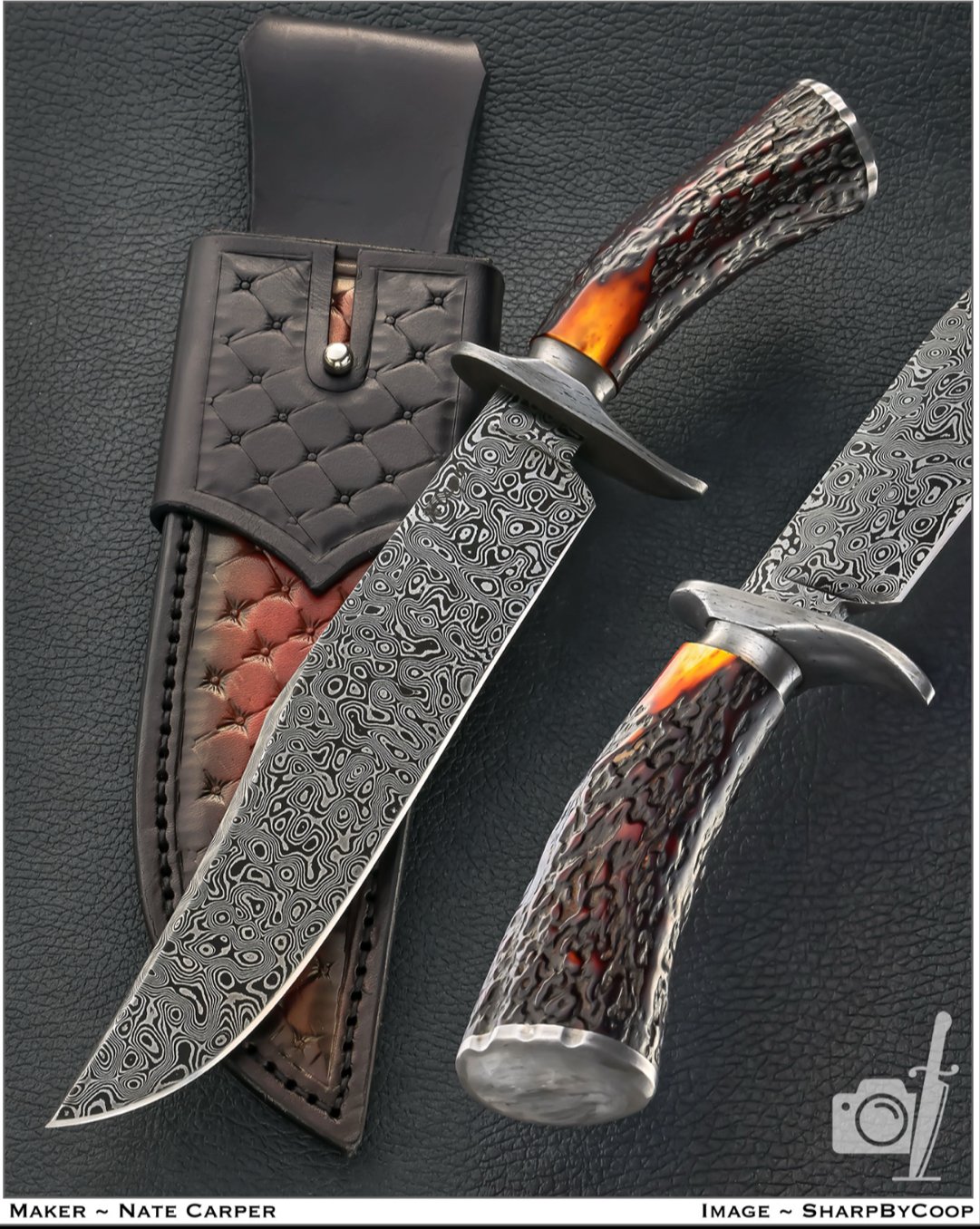 13” OAL, 8.25” Blade. This Bowie is comprised of a raindrop pattern Damascus. The guard, spacer and pommel were made of 150 year old wrought iron salvaged from a coal mine. The stag handle is amber dyed. Included is a custom hand stitched leather sheath with frog.