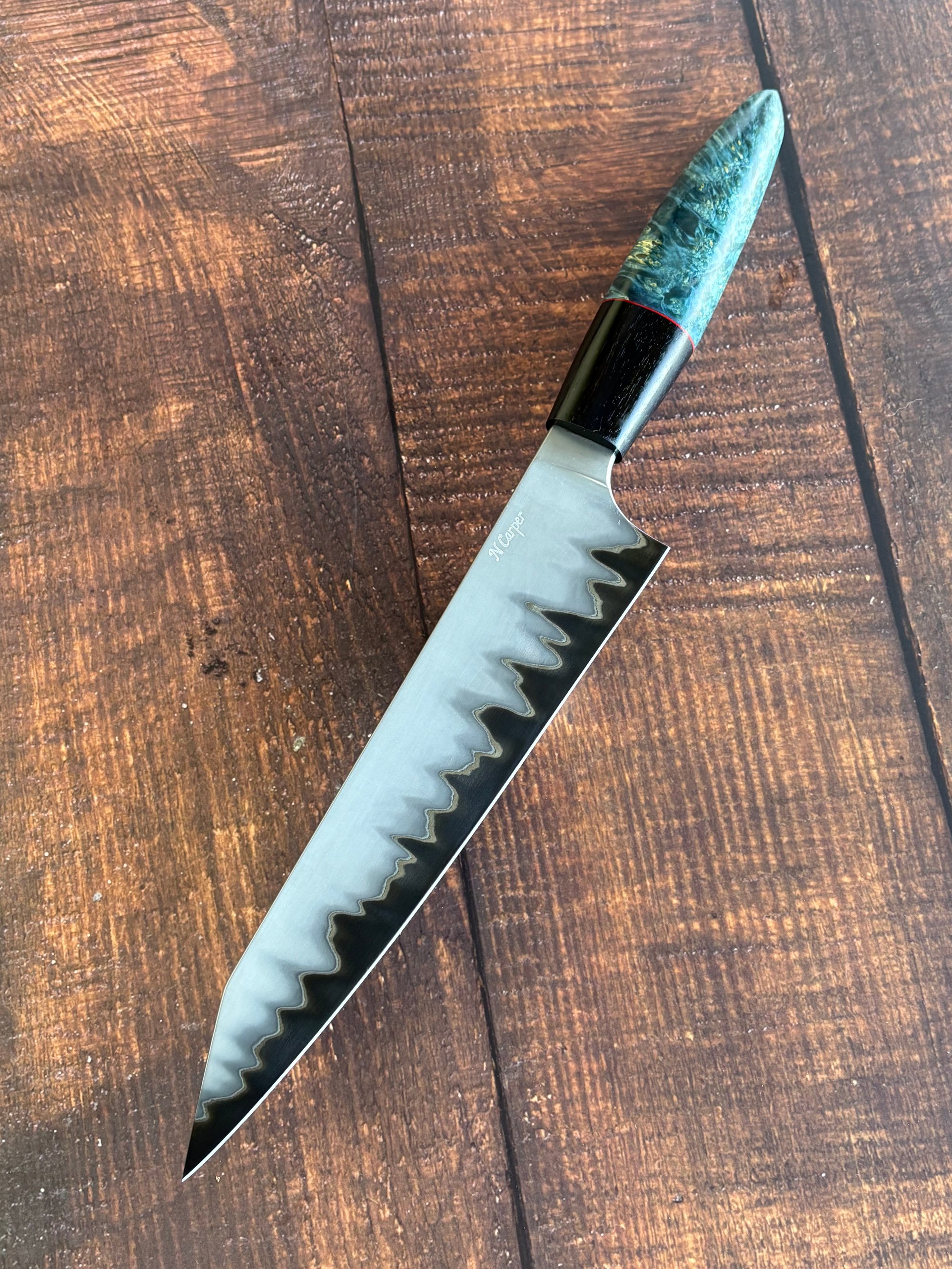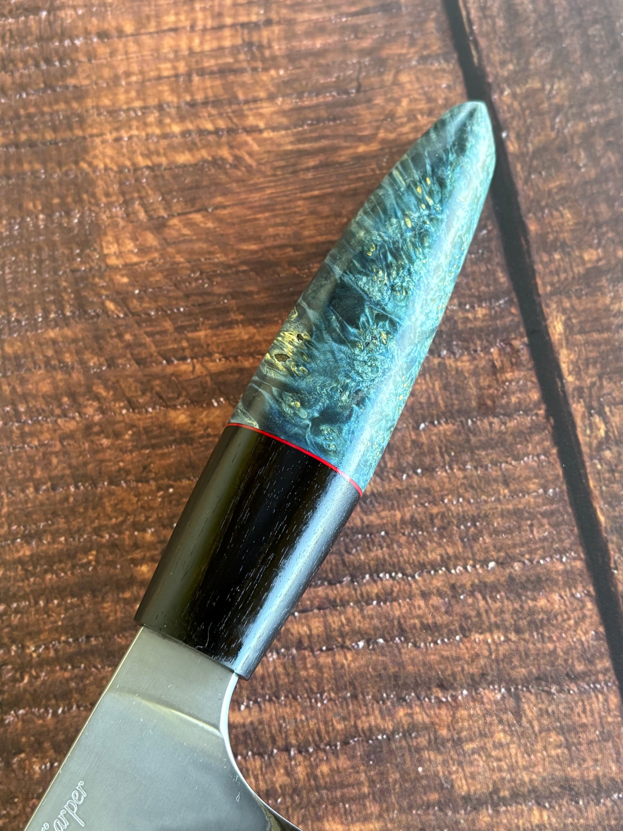 9.25” stainless steel/carbon steel San Mai Gyuto with ebony/red spacer and maple handle.